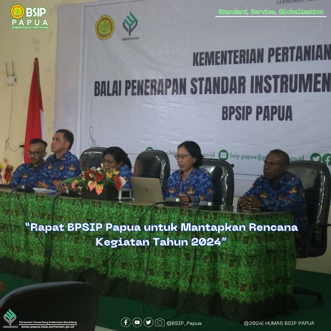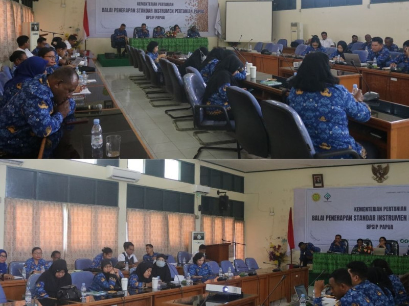| 63 | 17 Jan 2024 | Rapat Evaluasi Program Kerja Tahun 2023 dan Perencanaan Program Kerja Tahun 2024 | Kantor BSIP Papua Sentani | BPSIP Papua menggelar Rapat Evaluasi Program Kerja Tahun 2023 dan Perencanaan Program Kerja Tahun 2024. Rapat dilaksanakan di Aula BPSIP Papua yang dipimpim langsung oleh Kepala Balai Dr. Ir. Martina Sri Lestari, MP., dan di hadiri Tim Manajemen, Pejabat Fungsional dan seluruh pegawai BPSIP Papua serta tenaga PPNPN.